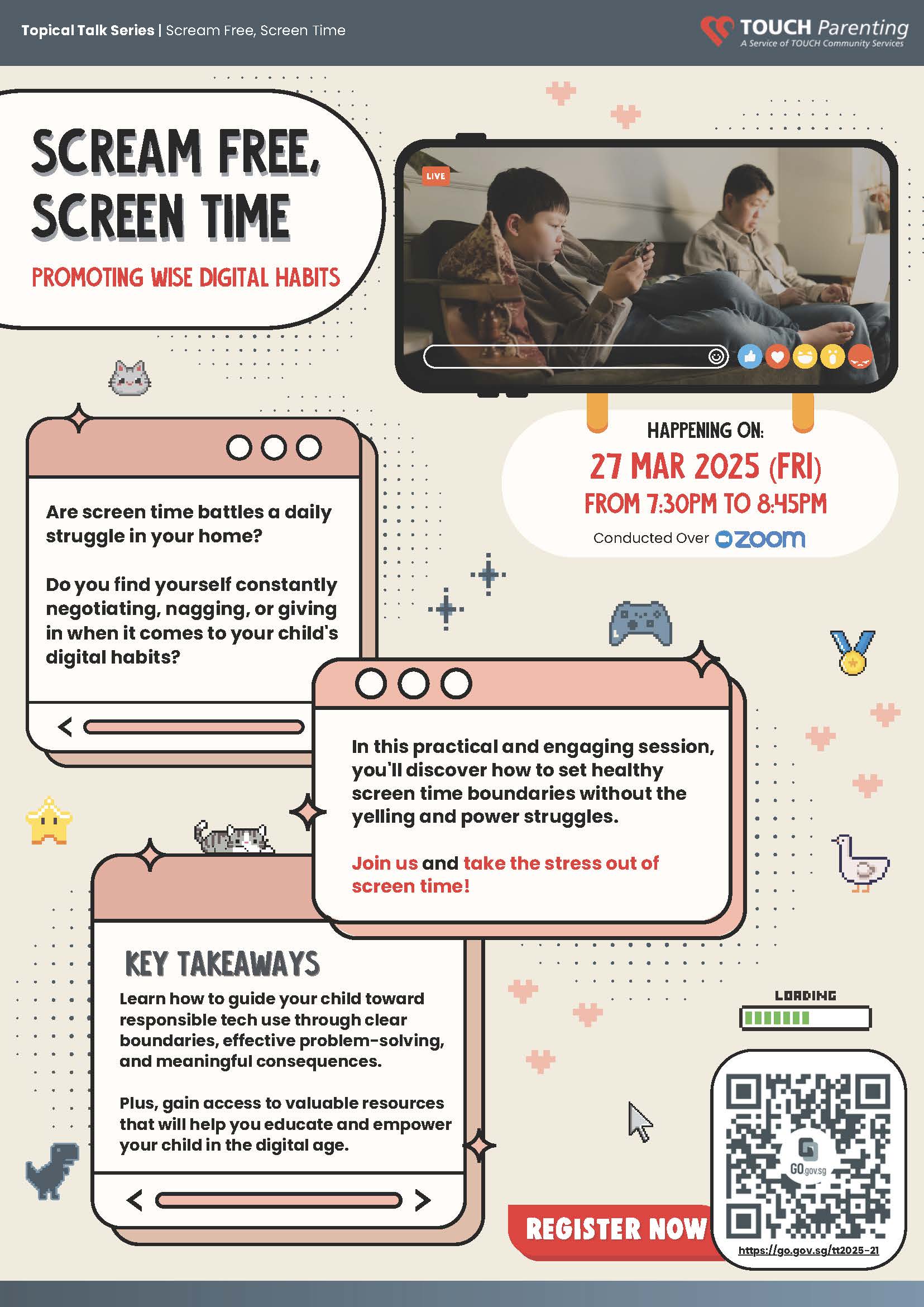 - An upcoming Scream Free, Screen Time Parenting talk by TOUCH Parenting on Fri, 27 March, 7:30–8:45pm (Zoom)